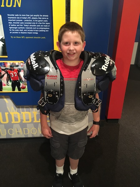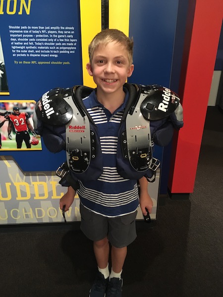 The boys enjoyed imagining that they were football players. We watched a couple of movies, one about what goes on behind the scenes, and one on the super bowl. John also enjoyed the last room where they had a bunch of xboxes set up with football games.