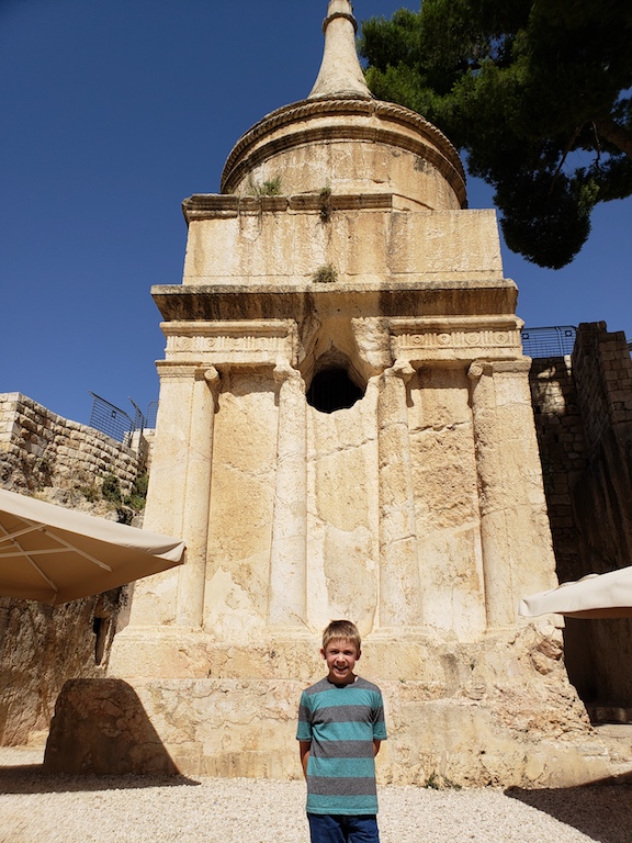 Finished with the Mount of Olives, we continued down into the Kidron Valley, where the tombs of Absalom and Zechariah lay.  It was fun, but hot.  The boys liked climbing around a bit, and there were 2 camels that were tied up that they enjoyed watching.