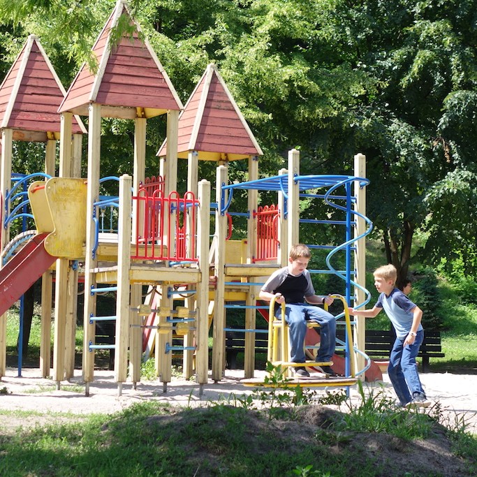 The boys found another park and we let them play until dinner time.  Why oh why do they enjoy spinning so much?  They spent most of their time on the merry go round again!  For dinner, we weren’t particularly hungry, so we stopped by another cafeteria style restaurant.  I was sad that my cherry/cheese filled pancakes were not as good as in Lviv.