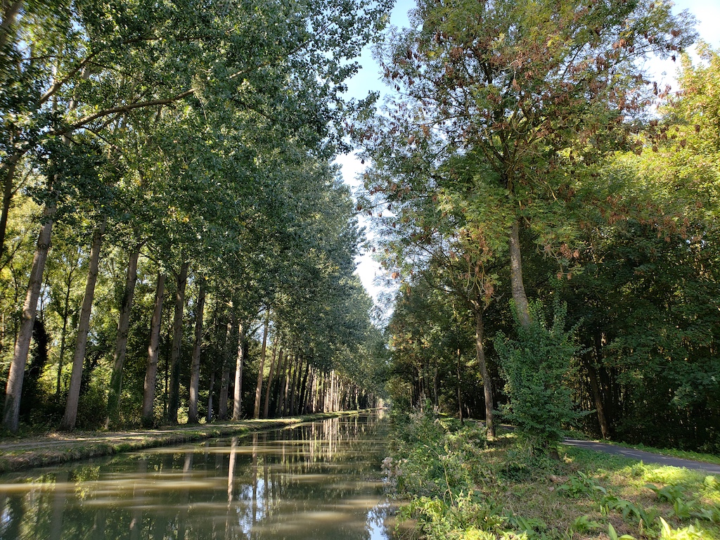 About 25 km (15 miles) from the hotel, the route changed somewhat, from the routes between villages, to an urban bike path along a canal. It was a fairly attractive bike path, with pedestrians separated out on a different path most of the way. There were many locals riding along it – it seems like this would be a nice casual weekend ride for somebody living in Paris.