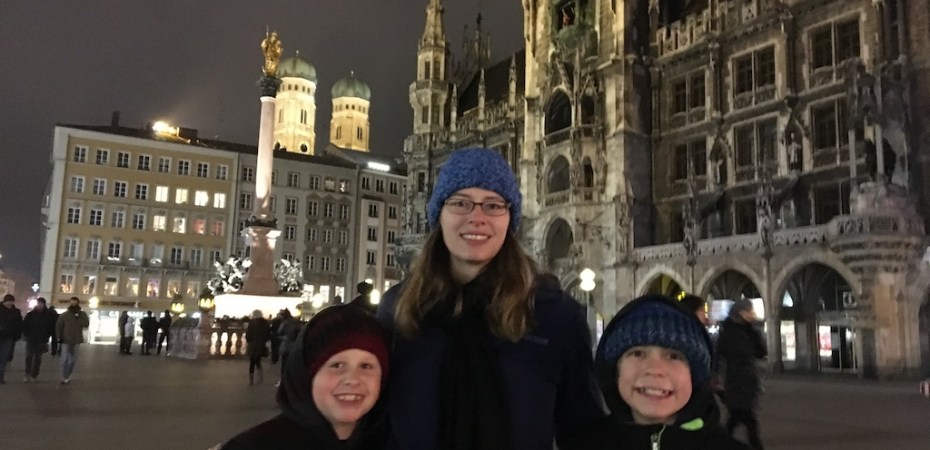 It was slightly unfortunate that it was January. In both California and India, there was no need for anything remotely wintery. Munich was another story. I ended up putting several layers of sweaters and jackets, plus some hats and lightweight cloth gloves, into the backpacks. We would probably be slightly on the cold side, but for one night, I didn’t want to bring more. The boys whined about “overpacking mom,” filling up their bags with unnecessary things, but then once they got outside, they realized in the cold that I really had slightly under-packed. Sigh.