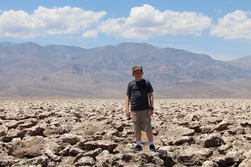 The next highlight is Badwater Basin, the lowest point in North America. From a distance, it looks like a gigantic lake, but no, it is dried salt. Can you imagine the disappointment the pioneers must have had when they made this mistake? No wonder this park has its name, definitely a deadly mistake. The boys tried a little of the salt found it fascinating that it actually tasted like…salt.