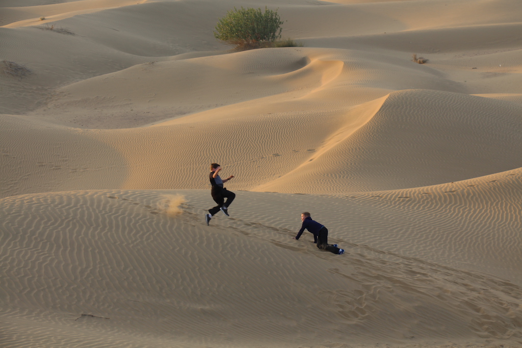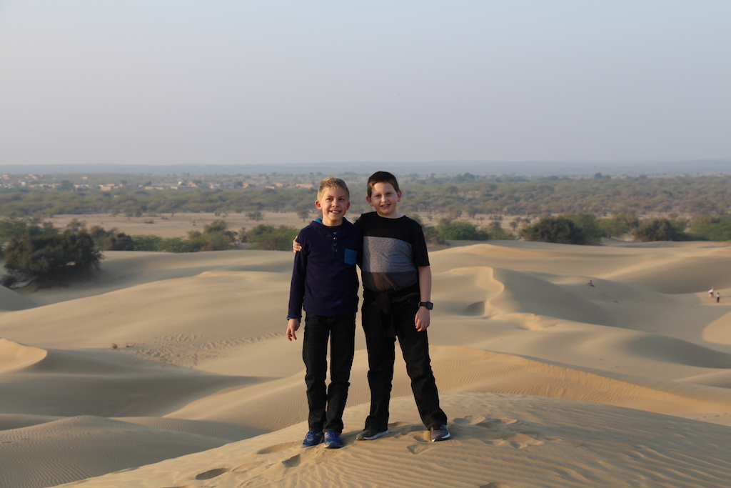The kids’ favorite stop in India was in the Khuri Dessert. After a very long drive from Bikaner, we arrived just in time to take a sunset camel tour through the desert.