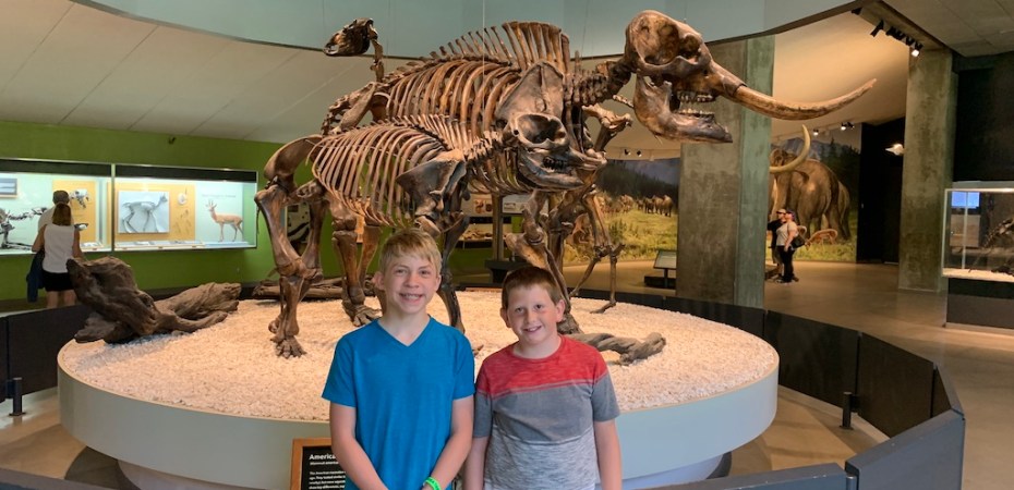 On the way out, the kids enjoyed one more sculpture of a now-extinct sloth.