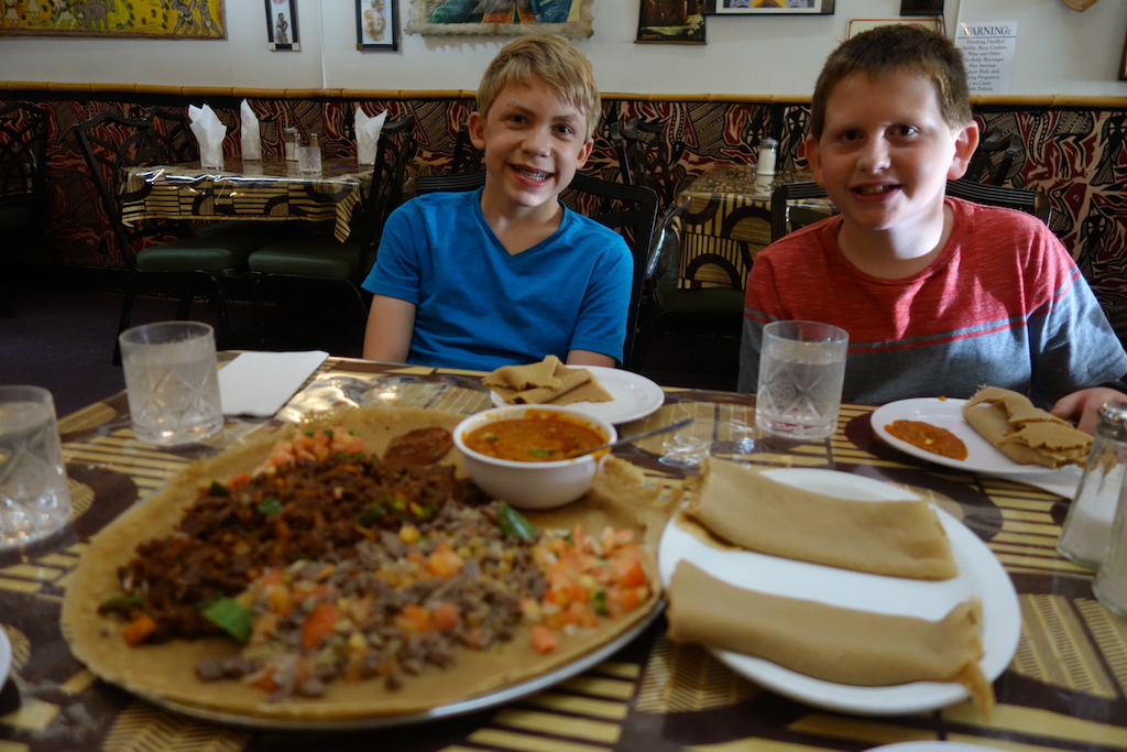 If you are unsure what to order, go for the spicy lamb tibs. So delicious! John always likes the vegetarian Shiro (chickpea based). Plus we usually get a 2nd meat, often times a less spicy beef. And what kid doesn’t like permission to eat family style with their hands? Simply tear off a piece of the crepe-like injera (a sour bread made from teff flour) and pinch/scoop up your favorite morsel.
