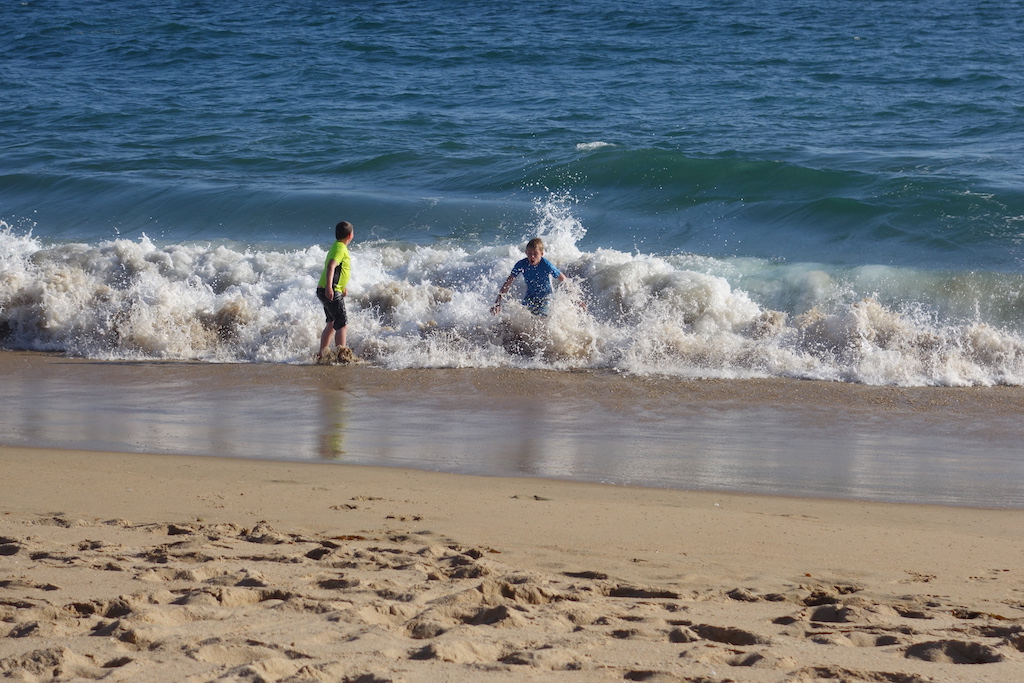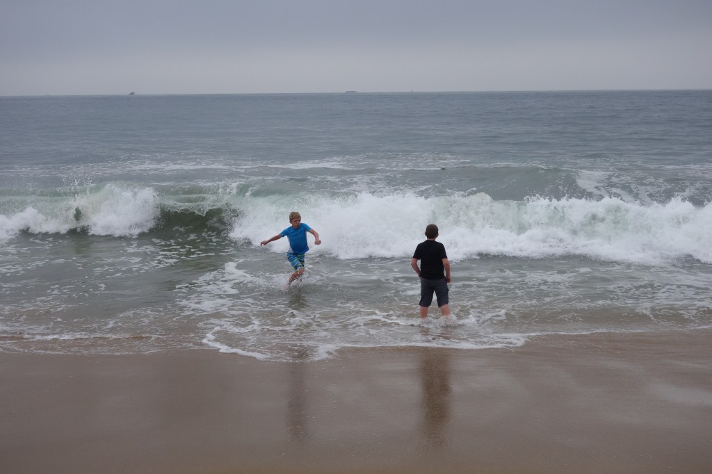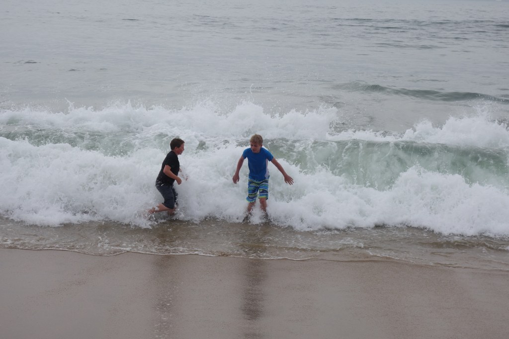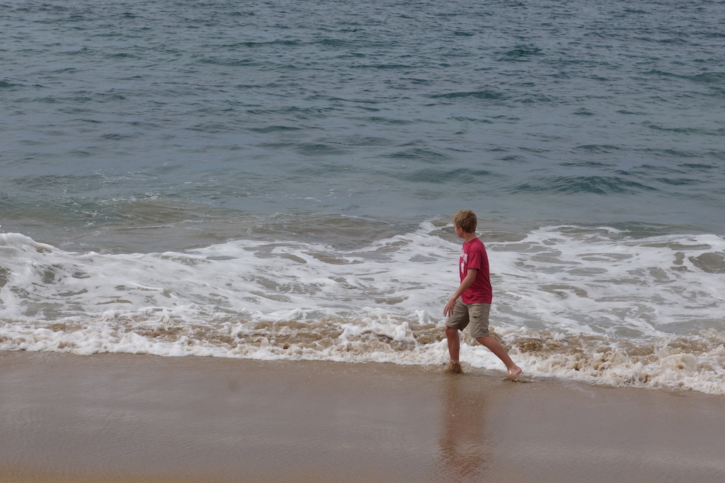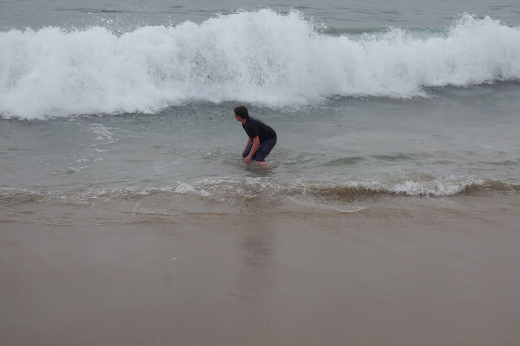 And enamored by the waves. I learned my lesson about his insistence that he didn’t need to wear his swimsuit. “Sure, I won’t get wet!”