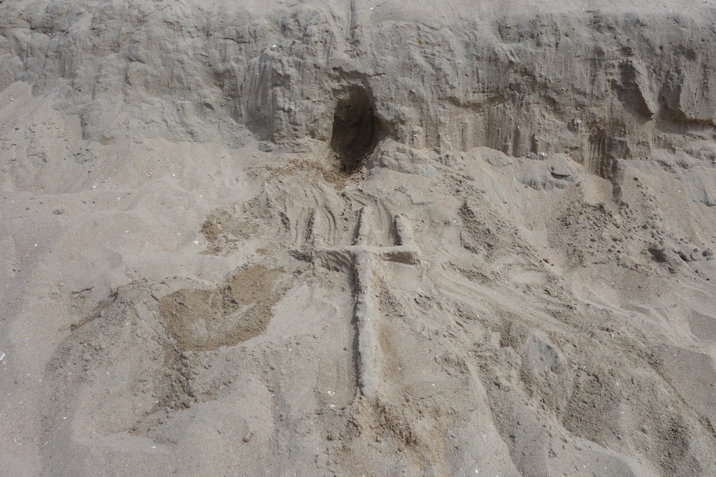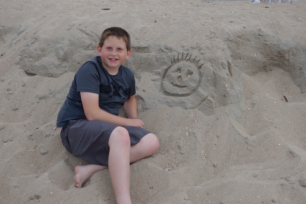 Meanwhile, John discovered that the cliffs were quite hard and perfect for some sand art. He started with a smiley face, then moved on to Poseidon’s favorite weapon.