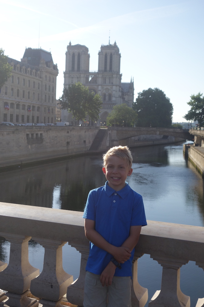 While walking to Notre Dame, we walked around l’Île de la Cité, the small island in the Seine where Notre Dame is located. At the far point, we came to Pont de l’Archevêché, A.K.A. a “Love Lock Bridge.” When the boys asked why there were so many locks, we told them that when people fall in love, they will often write their initials on a lock, fasten it to a bridge, then throw the key in the water, symbolizing that they are forever locked together.