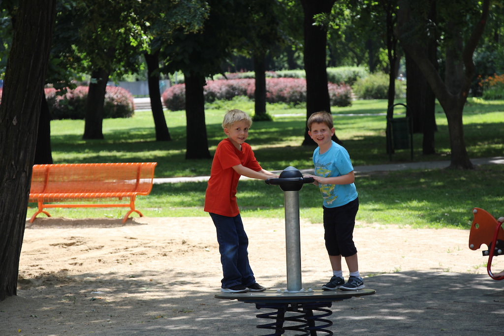As we continued through the park to the Széchenyi Thermal Baths, the boys saw a playground and trampoline park, so we decided to stop. One of the best parts of traveling with kids are discovering the differences between playgrounds in various countries.