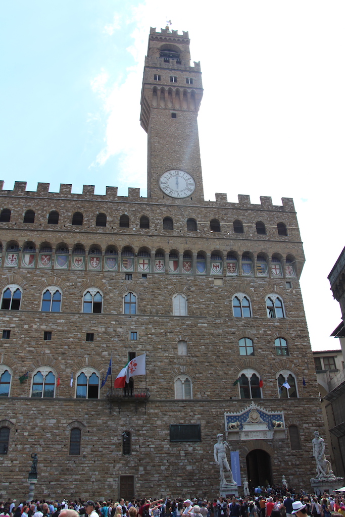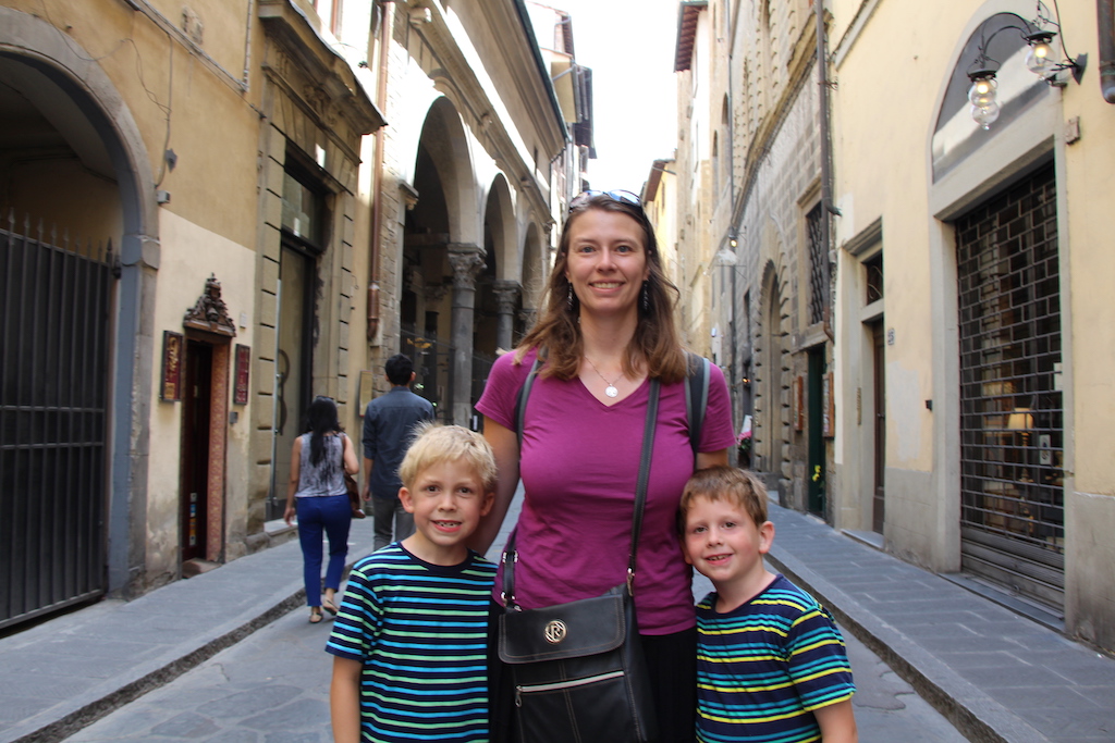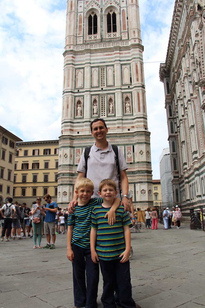 Our morning started with a fast train ride from Rome to Florence, stowing our bags in the train station lockers on arrival. The original plan was to go to the Galleria dell’Accademia to see Michelangelo’s David, but after standing in a ridiculously long line that was completely in the sun and completely at a standstill, after 15 minutes we decided to skip it. Alas. But we showed the boys the replica in the square. If you want to visit this museum during the summer crowds, I highly recommend purchasing advance tickets.