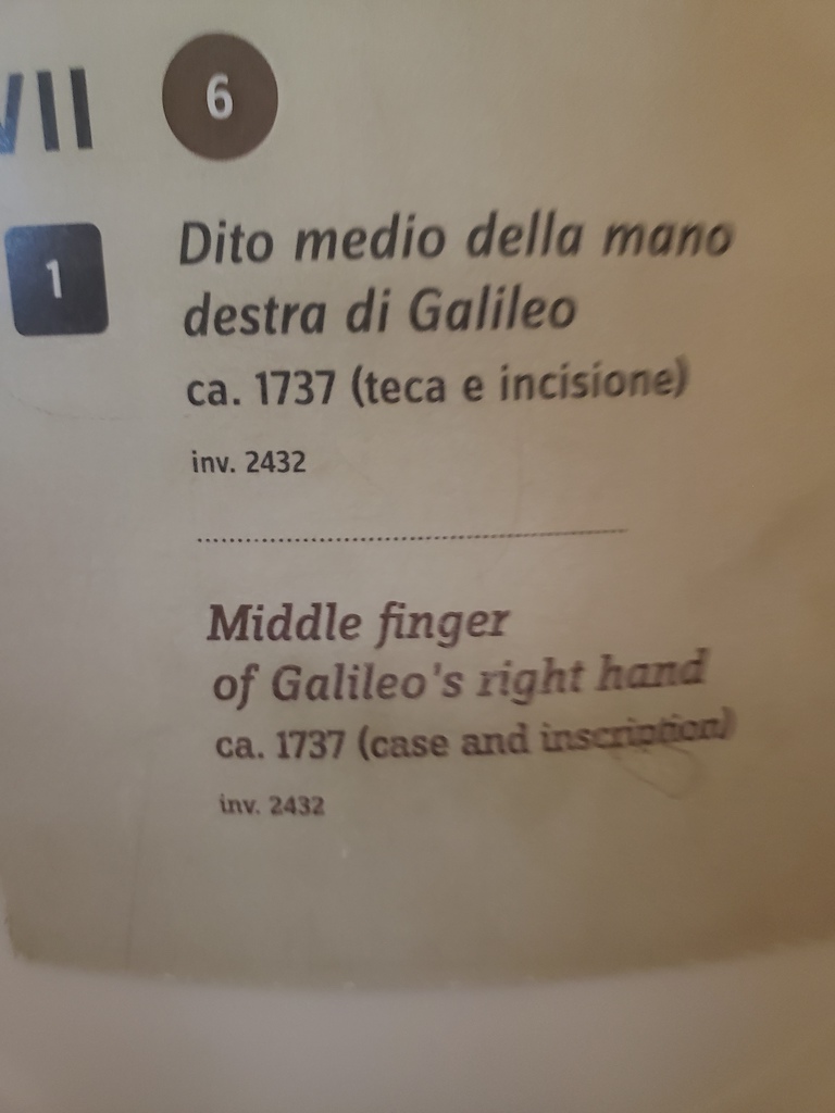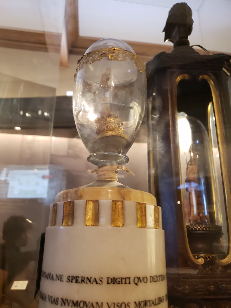 The strangest thing we saw was a case that held Galileo’s middle finger. Odd. Not great pictures, but here it is: