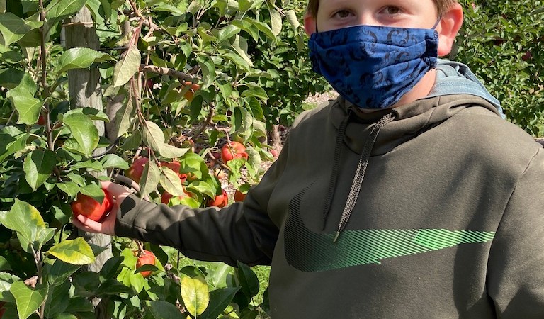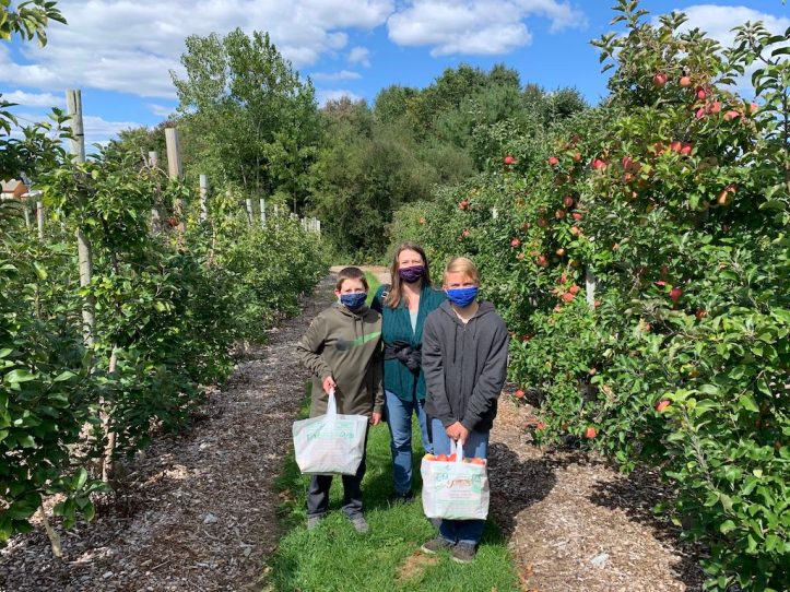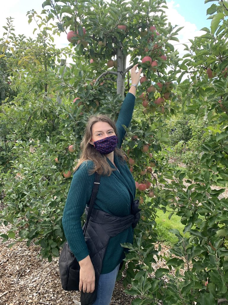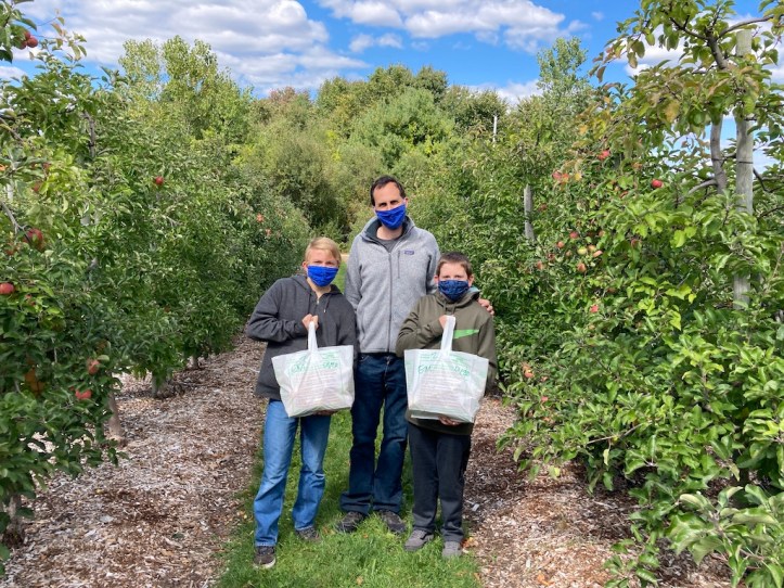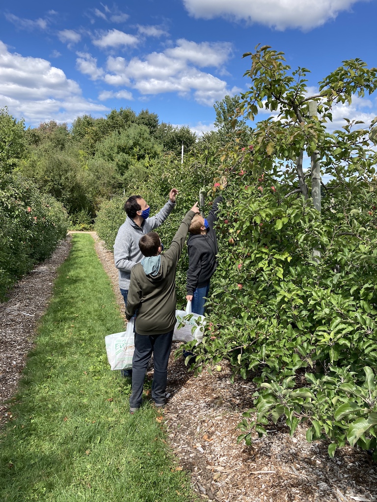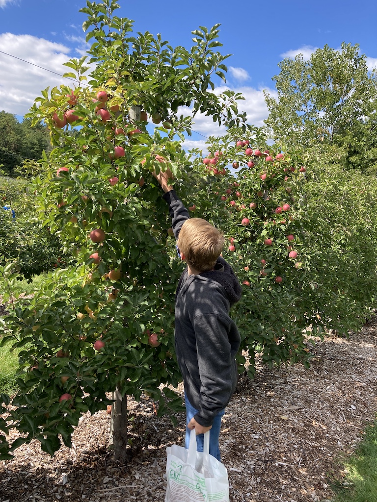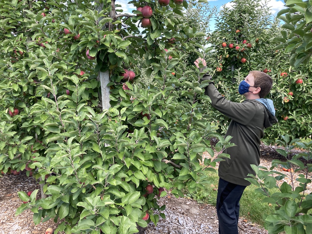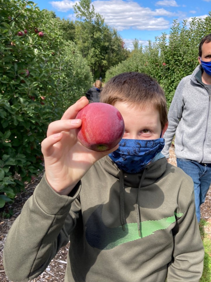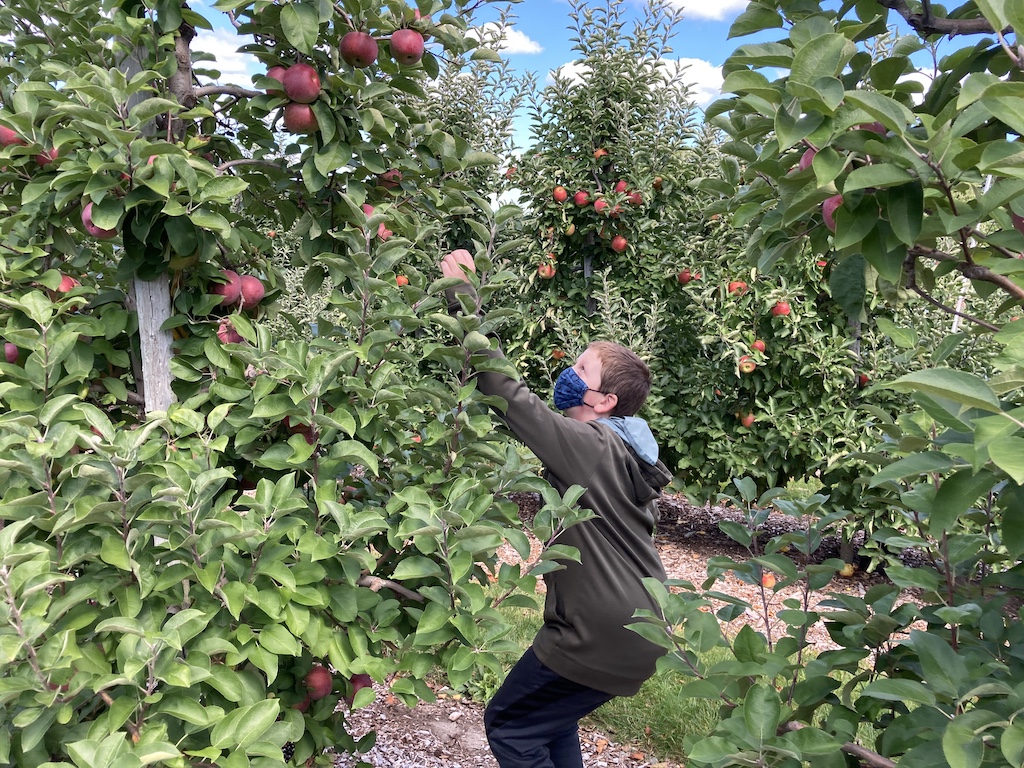 Of course, Covid-19 makes this year different than others. You can’t taste the apples at the orchard, and many places require reservations or lines to avoid crowding. In the past, our memory was that you picked into a bucket and it was priced by weight afterwards, but this year, they just sell specific-sized bags for you to fill, to minimize contact. We skipped the (partial capacity) hayride, and the children’s petting zoo was eyes only. But it is still possible to have a lot of fun.