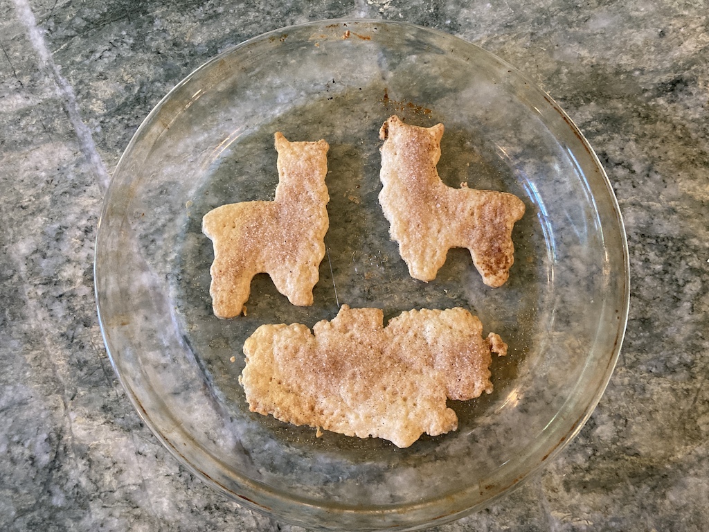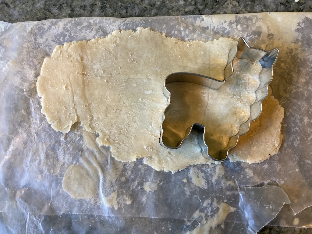 We also had a little leftover pie crust, so I cut it into fun alpaca shapes, made a blob for the grass, sprinkled it with cinnamon sugar, pricked it all over with a fork, and stuck it in the oven with the pie for about 15 minutes. If I am in a hurry, I simply roll it into a disk. Also, you may need more or less time, depending on what temperature you are baking your pie.