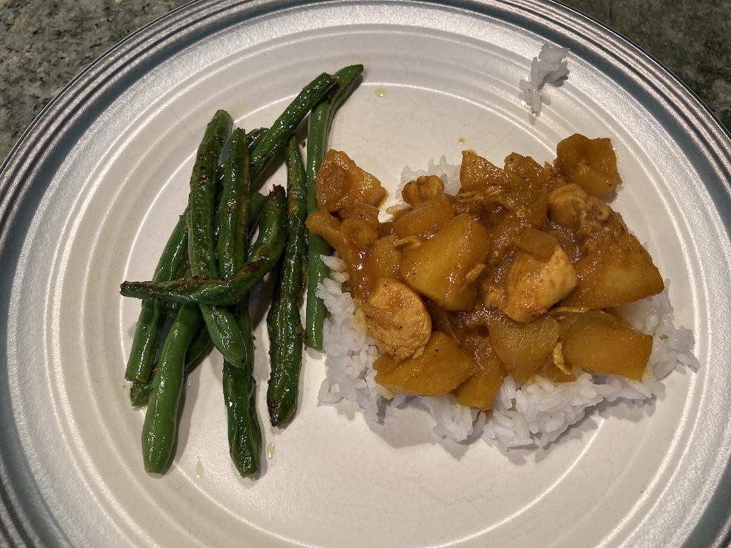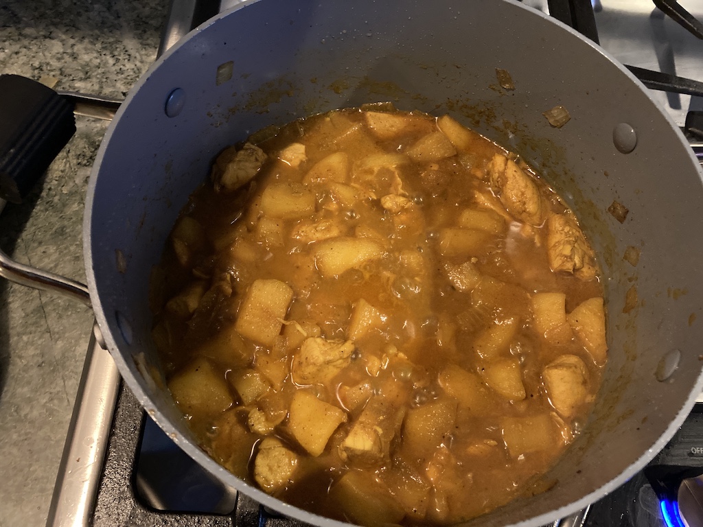 Jeremy was sick of apples for lunch, so we took a breather, but for dinner, we were back on the apple bandwagon. Deciding to try another idea from the website above, we went with the Japanese Apple Curry. Since there was no working link for a recipe, I found a Japanese Apple Chicken Curry recipe elsewhere. Oh my goodness! It was amazing! If you have time, try this recipe. Not having any curry powder, I made my own Japanese Curry Powder, leaving out the ground fennel, and frying a few whole fennel seeds the last few minutes that I was cooking the onions.