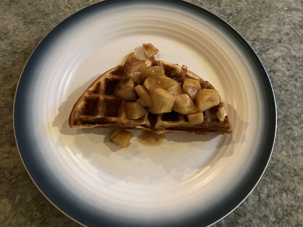 The next morning, the kids wanted more fried apples, so I cooked up some waffles and we used the apples in place of syrup. When using them for this purpose, while the apples will release some juice, make sure you add a little extra sugar so that you will have enough sauce for everyone. We also enjoy these on pancakes and crepes.