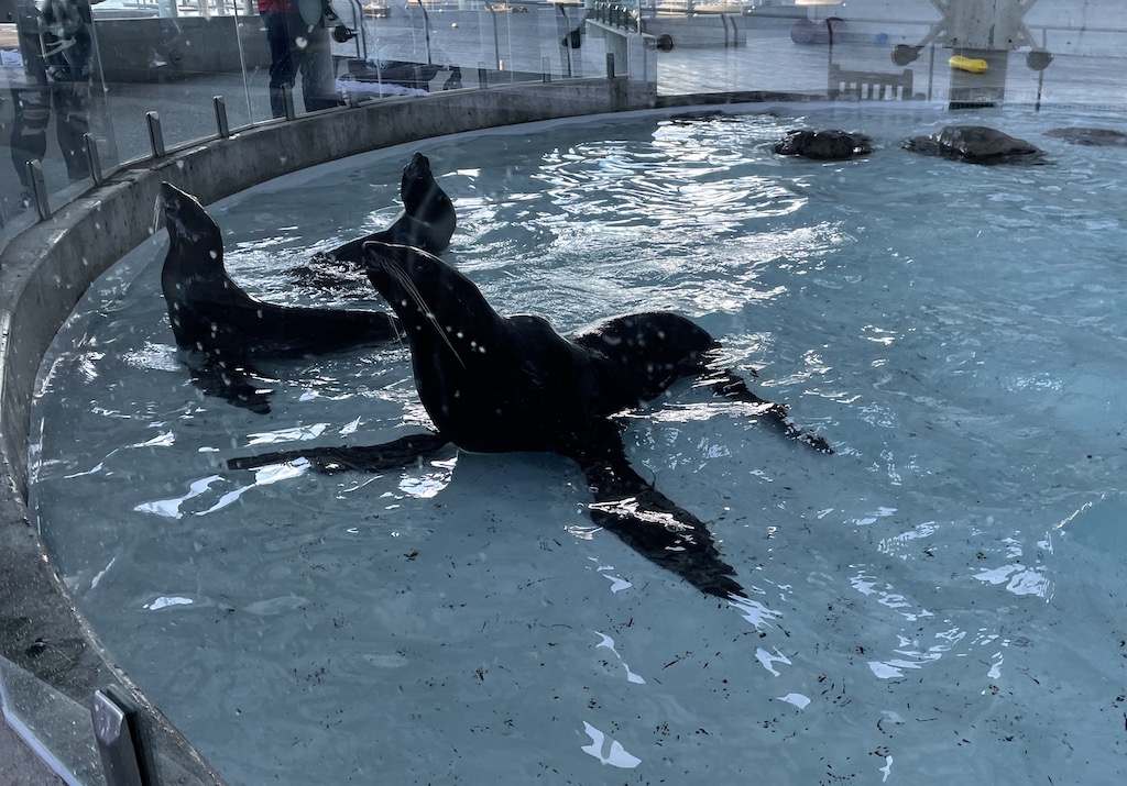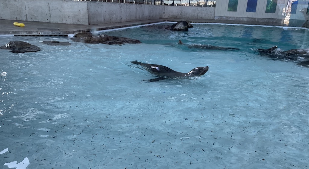 If you are just walking by the aquarium and don’t have tickets, there are some nice windows by this particular exhibit, so if you take a peak inside, you might get a glimpse of these playful animals.