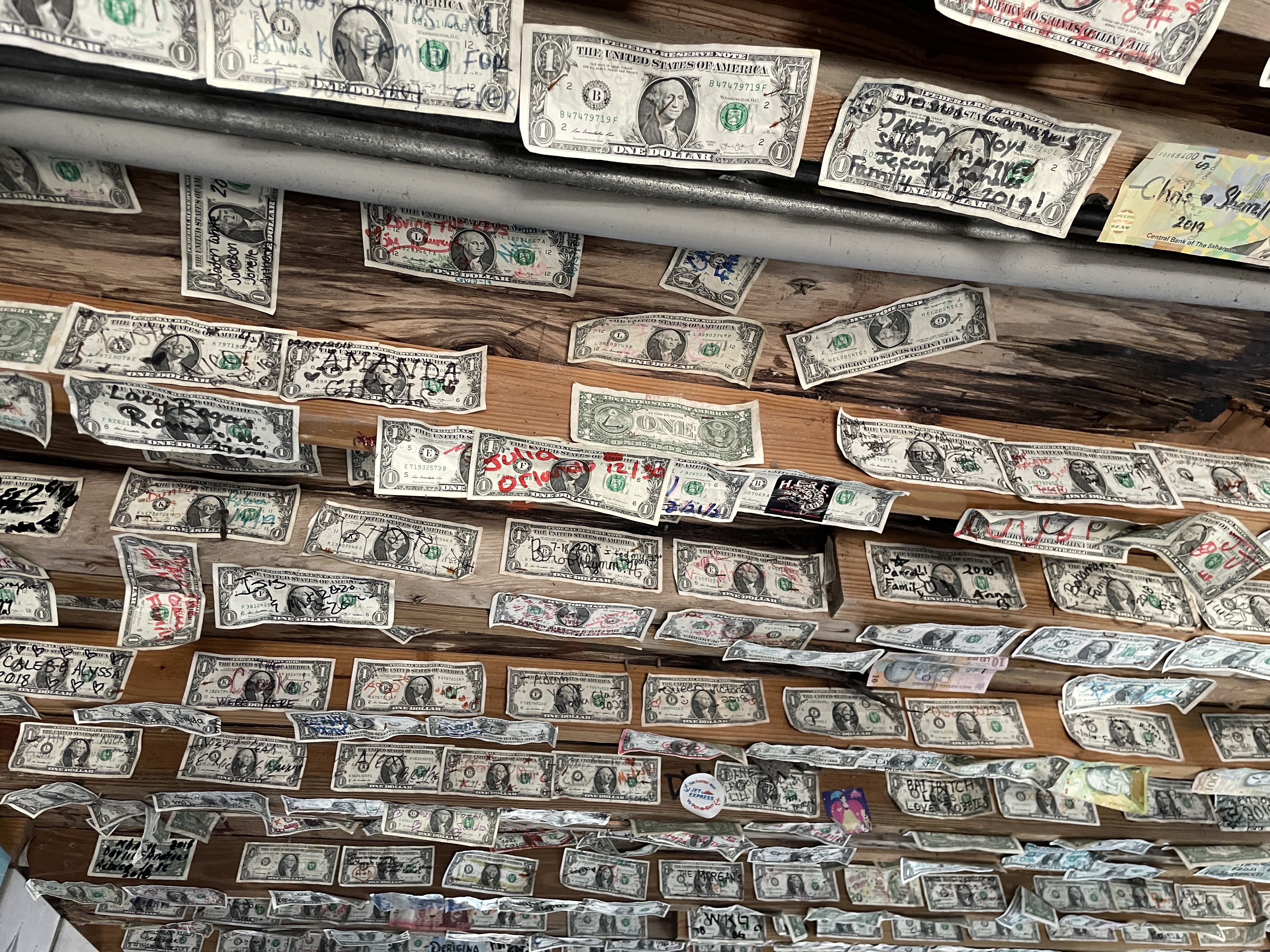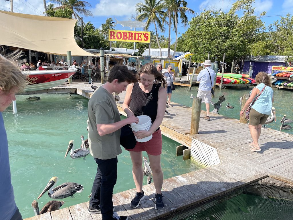 When we visited Robbie’s, tickets to the feeding area were modest – $2.50/person, plus $4/bucket of fish. As you stand in line, you will see lots of dollar bills stapled to the ceiling. Apparently it was a tradition that when fishermen went out to sea, they would staple a dollar to the wall or ceiling of a bar so that they would have money for a drink upon their return.