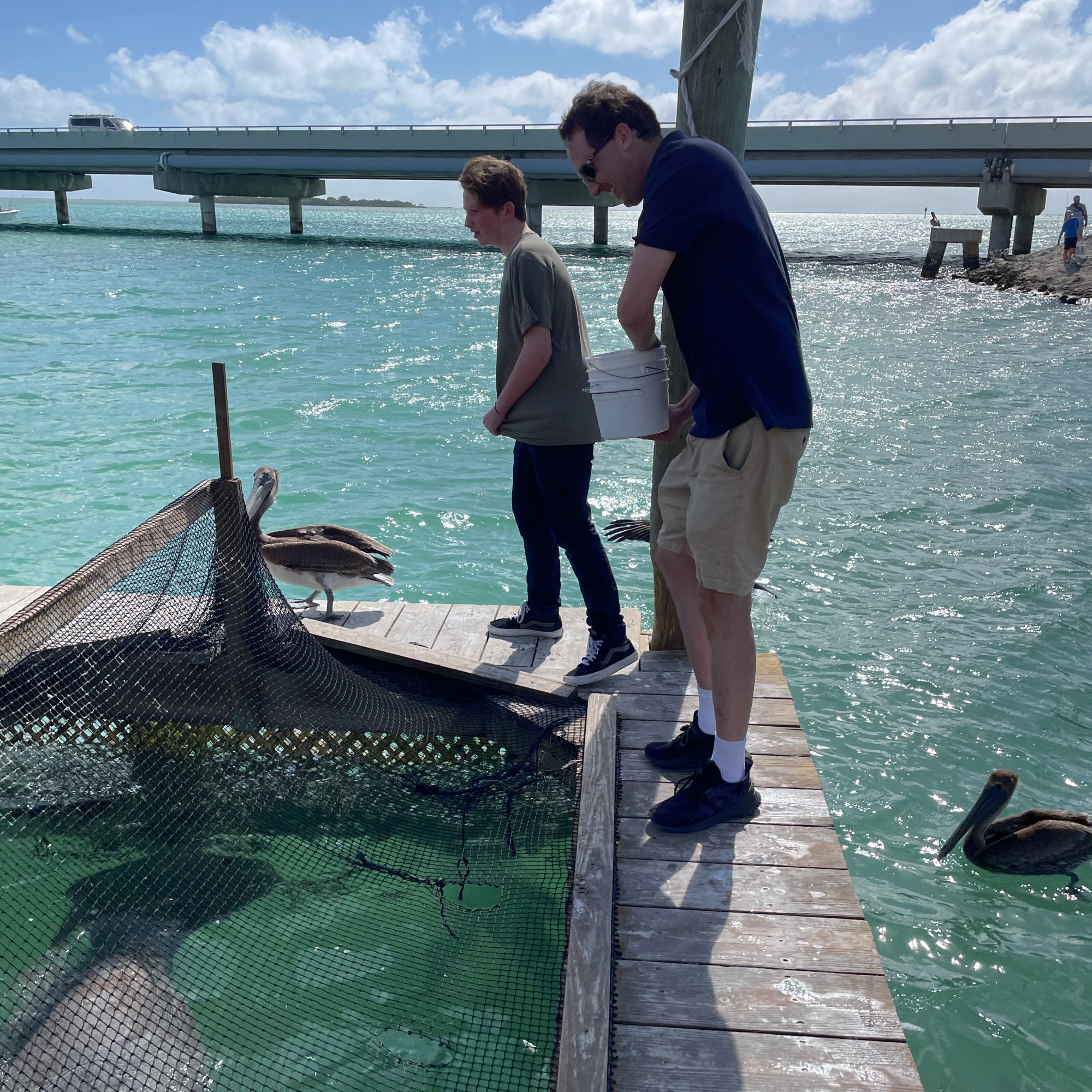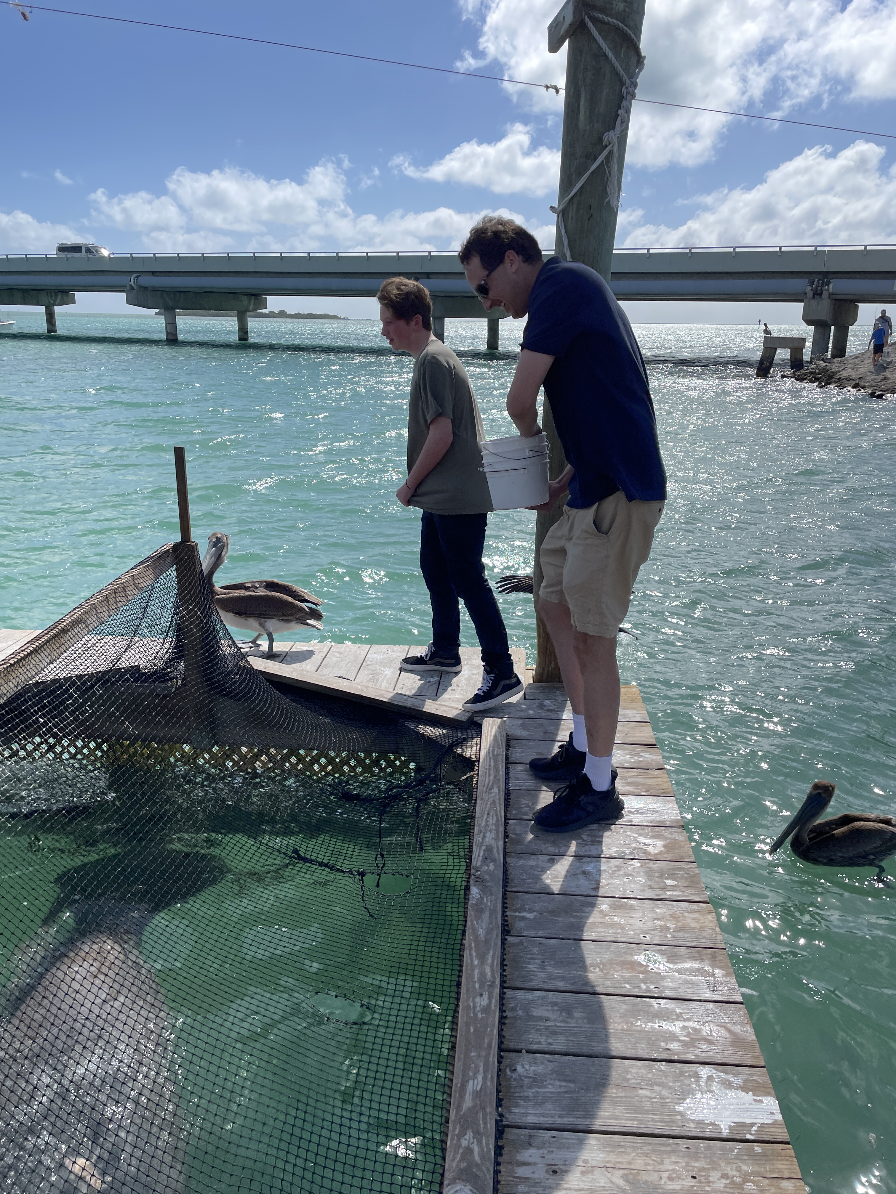 At first, we were really worried about lowering our faces to the holes in the nets, as no one wanted a bit to the face! Fortunately, we quickly learned how to shoo the pelicans away and position ourselves to protect the person feeding the fish.