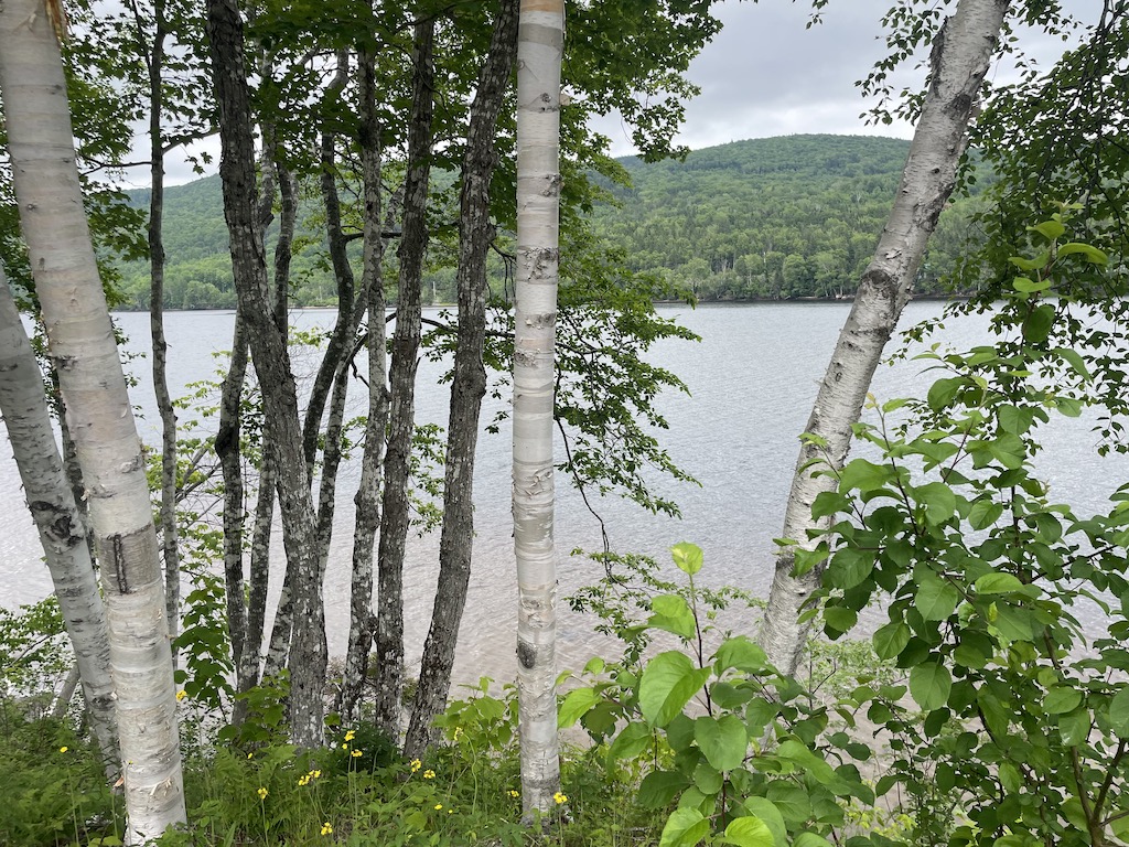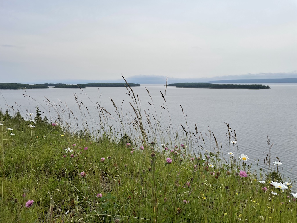 Fortunately, once we got within about 10 miles of Baddeck (where we would stop again on our way out), flowers started blooming, lakes started popping into view, and we were much happier! Once we passed Baddeck and made it to the ocean, things were even nicer: