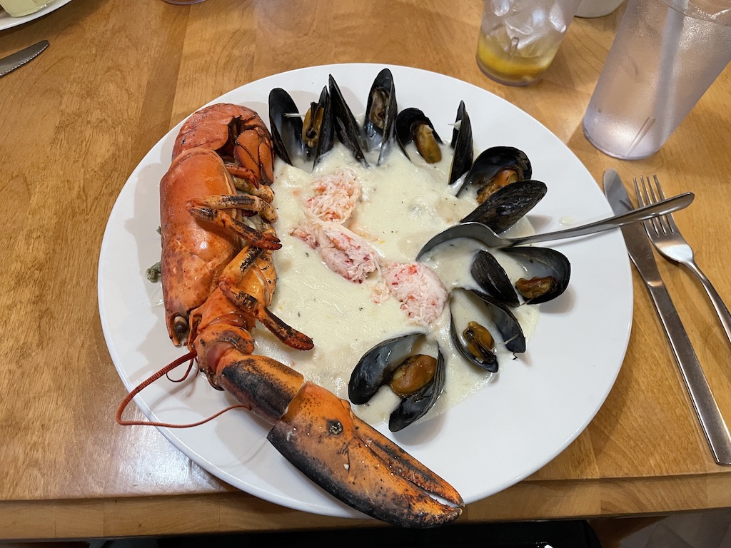 When looking up dinner options, we realized that most restaurants closed at 7:30pm. Yikes! We needed to get a move on! We settled on the Coastal Restaurant and Pub and I ordered a special with seafood chowder topped with crab, muscles, and a half lobster. Delicious, although eating a lobster sitting on top of clam chowder is almost as messy as it sounds!
