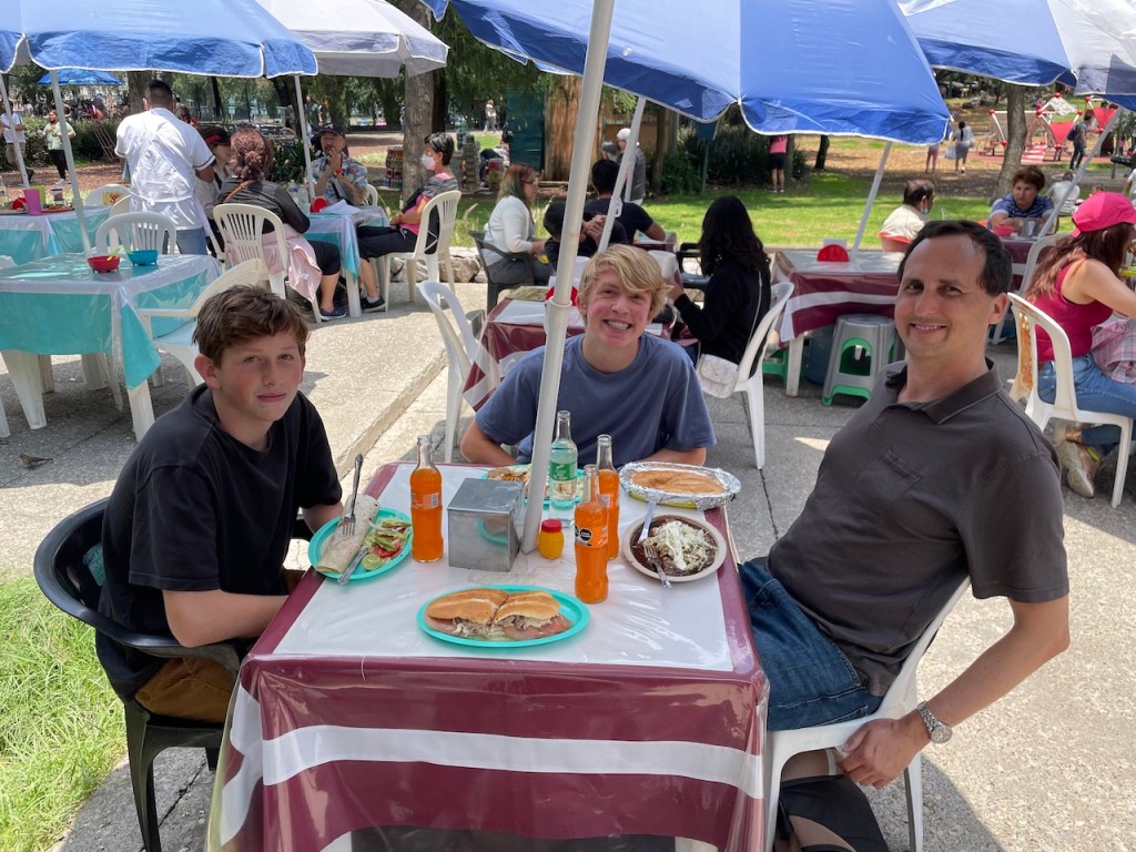 Starting to feel a little hungry, we decided to go to one of the outdoor restaurants by the lake. Having seen signs for tortas all over the city, I decided to order a beef, ham, and cheese torta. As it turns out, torta is the word for Mexican sandwich. Delicious! This time John was the odd man out. He had ordered a beef burrito, but the filling did not have beef in it. He tried to enjoy it, but really did not like whatever was inside. Sometimes ordering food works well, and other times miscommunications abound. When traveling with kids, sometimes you need to make a backup plan when food is involved.