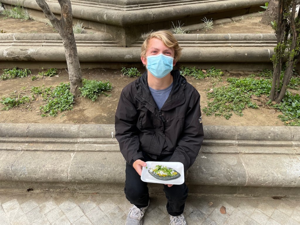 Along the way, we decided to stop at a french bakery and get some treats. Then we came to the park with a small market next to it that we had seen the previous day. James remembered that this was where he had seen his “blue tortillas” and we decided to stop and get him one. He got to choose one filling, then the woman topped it with a bunch of tasty taco garnishes. He was delighted. John eventually decided to try a bite of this strange looking taco and decided he loved it and got one too. We picked up a couple of other small things and had a delightful dinner!