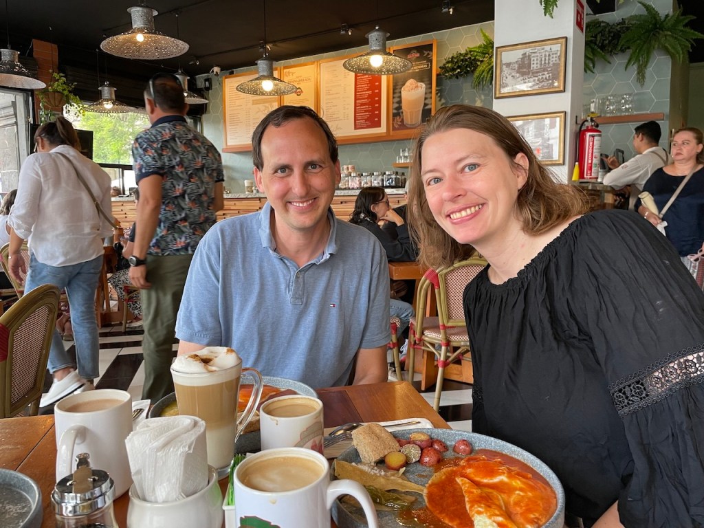 Having not been thrilled with our expensive hotel breakfast the day before, we found a cute local chain cafe and got breakfast there. The boys were thrilled with their pancakes, while Jeremy and I tried various Mexican egg dishes. Delicious! My large cappuccino was very, very big, but quite beautifully presented.