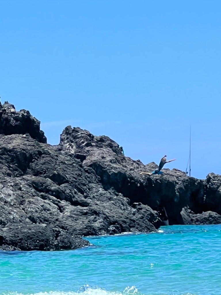 The boys’ favorite part was probably the cliff jumping. As the morning progressed, we watched person after person jump off a cliff at the end of the beach. At first we told the boys that it was way too dangerous, but eventually they talked me into swimming out with them to check out the safety conditions. While cliff jumping always has its risks, this particular spot seemed to have a decent ledge with a big pool underneath. I was reasonable certain that they wouldn’t scrape their bodies along the rocks on the plummet down and that they wouldn’t crack their heads on the ocean floor, so I let them jump!