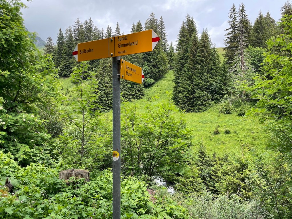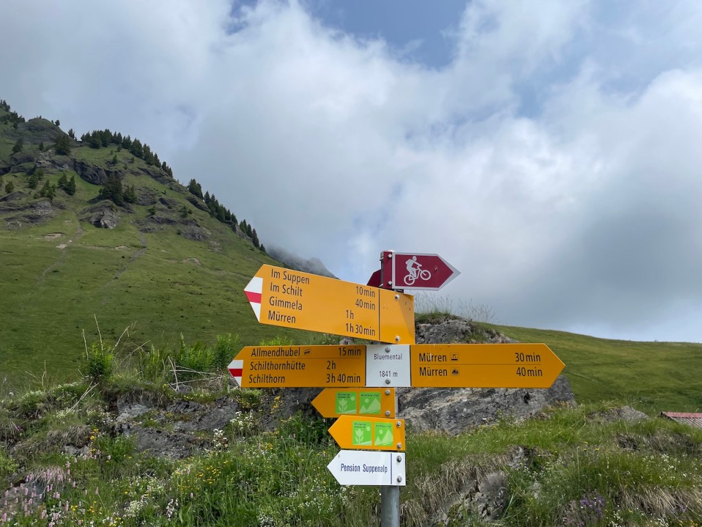 Eventually, you will come to to a set of junction points that will either take you back to Mürren, or down the mountain to Gimmelwald. There are several paths to Gimmelwald, and while all of them will be steep, most of them will only take you in the downhill direction. You can see one particular sign below that has two different paths to Gimmelwald.