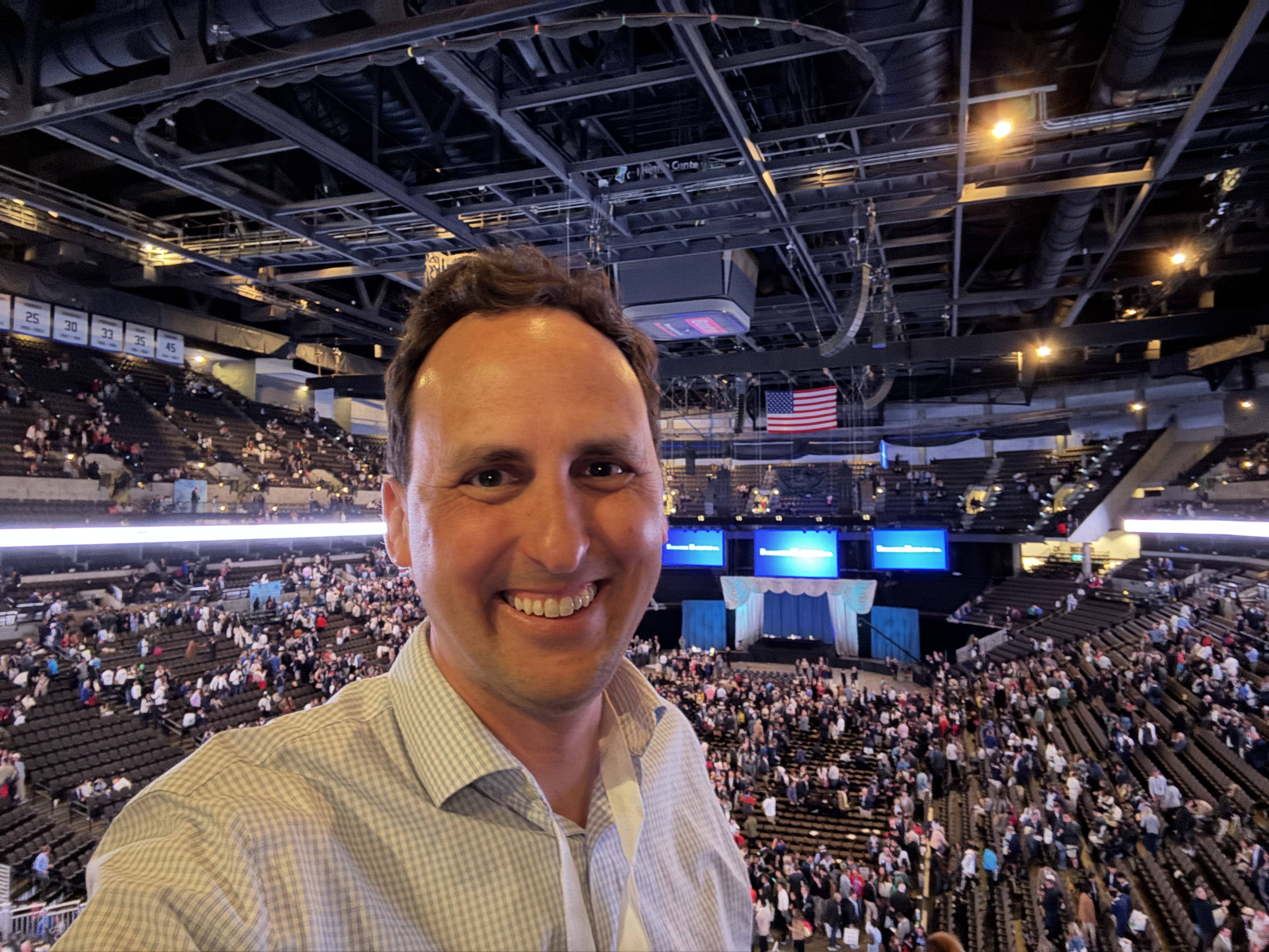 I waited in a snaking line, and took over an hour to get in. Some of the old timers in line next to me said that they’d never seen it like that before, and was unclear whether we’d get inside. I actually listened to the first few minutes of the meeting streaming on my phone, but I did eventually get in, and did find a seat at the top. Below I got a shot of myself as well during a break after people filed out.