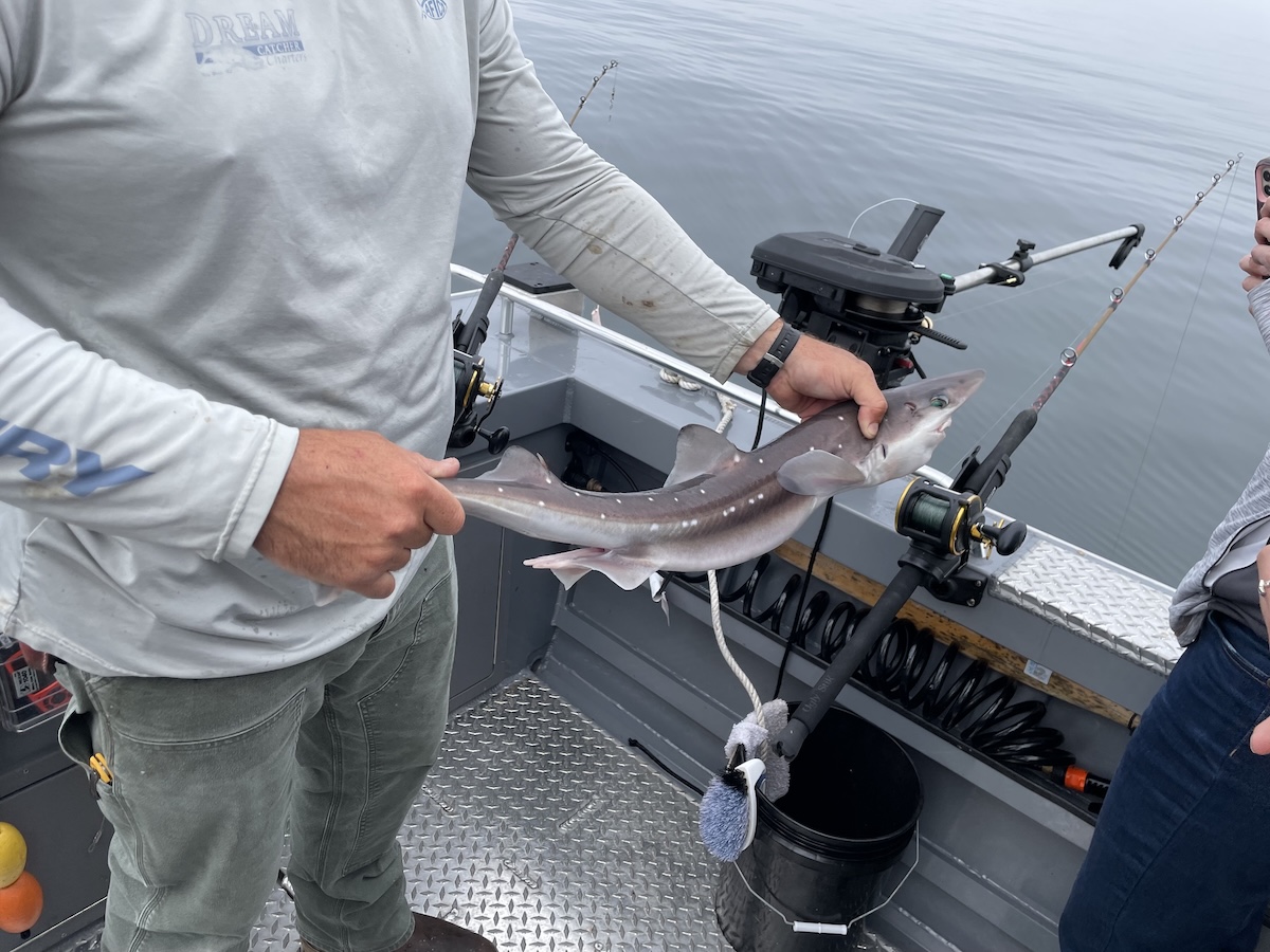 The halibut are a deep-swimming bottom fish, while the salmon swim more shallowly. The limit for halibut aboard a charter is 1 per person, so after the two of them caught their limit of halibut, John switched to salmon fishing while Jennifer continued to fish for cod. The other folks had some trouble catching their limit in halibut, they kept accidentally catching some sharks, which are not good for eating.