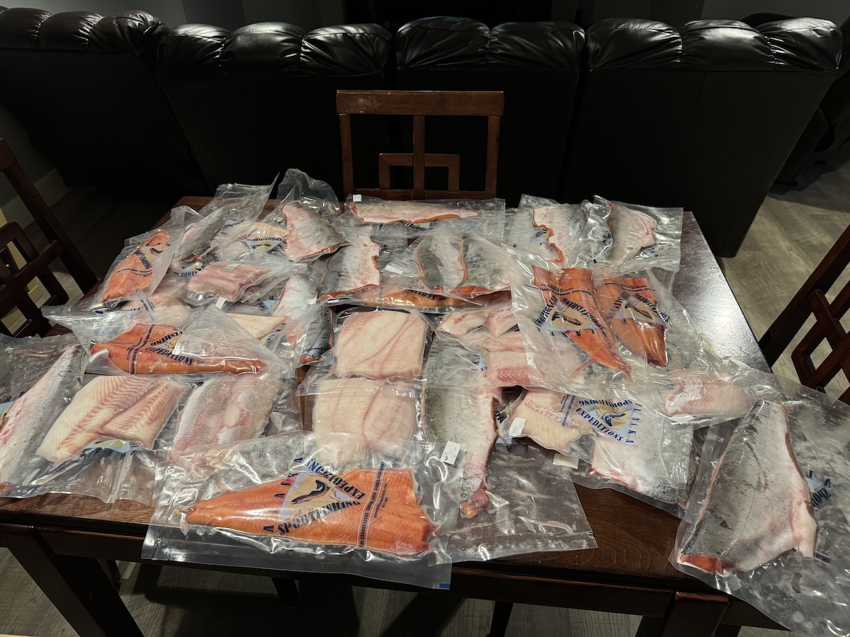 On the ride back, they filled out paperwork for shipping the fish catch back to our house. We were able to pick a future date after we got home. The shipping service wasn’t inexpensive (and for the pink salmon, whether it was “worth it” was debatable, oh well). But given the cruise, it simply wasn’t practical, or allowed, to take the fish back in the cabin. We got a few snapshots at the end of our collection of fish.