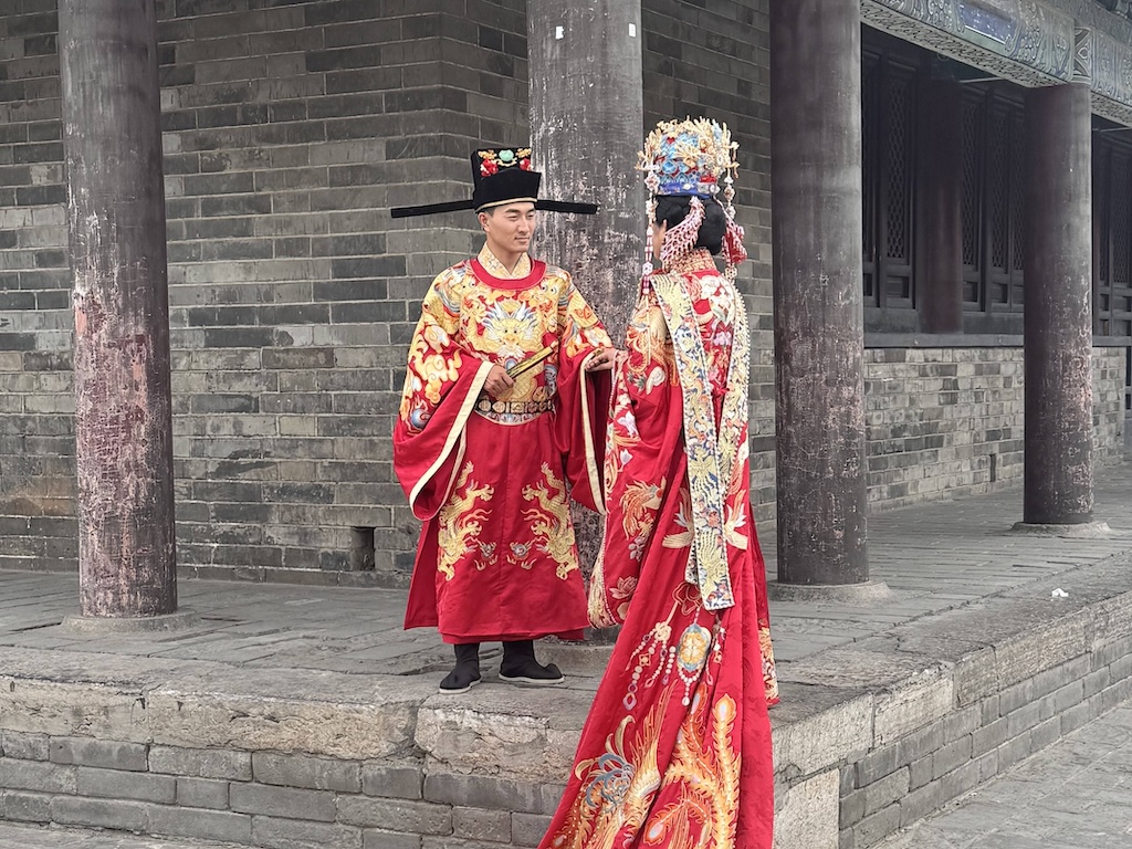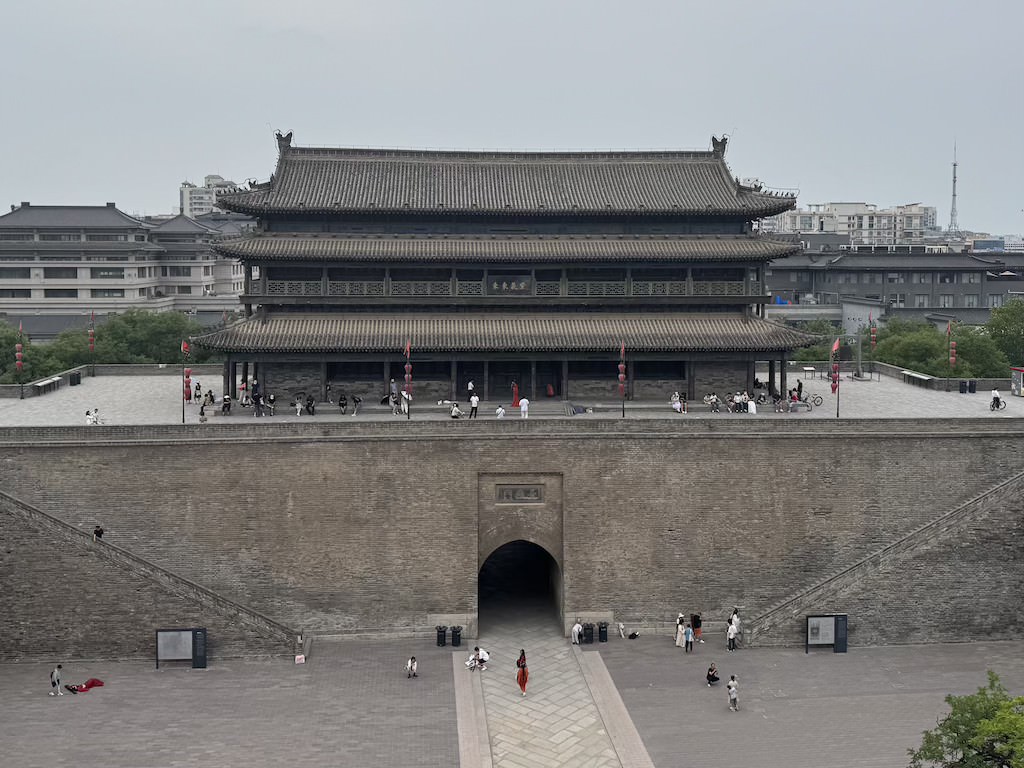 The Xi’an city walls are fairly impressive fortifications around the center of the city. The perimeter around them is 14km (8.7 miles), and actual walls are roughly 15 meters (49 feet) thick. There are 4 main entrance gate areas – North, South, East, and West, along with some intermediate entrances. By the main parts, there are shops, refreshments, and plenty of locals getting their photographs taken on the iconic locations, sometimes in traditional costume.