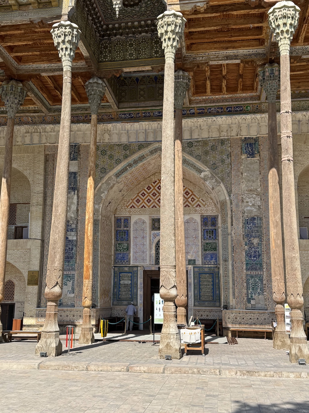 At that point, we walked over to the area by the neighboring Kalyan Mosque, and the madrassa areas next to it. It was originally built in the 12th century, though somewhat expanded in the 16th century. At this point, I can recall the temperature outside climbing, but fortunately a lot of shade in the different covered sides of the buildings.