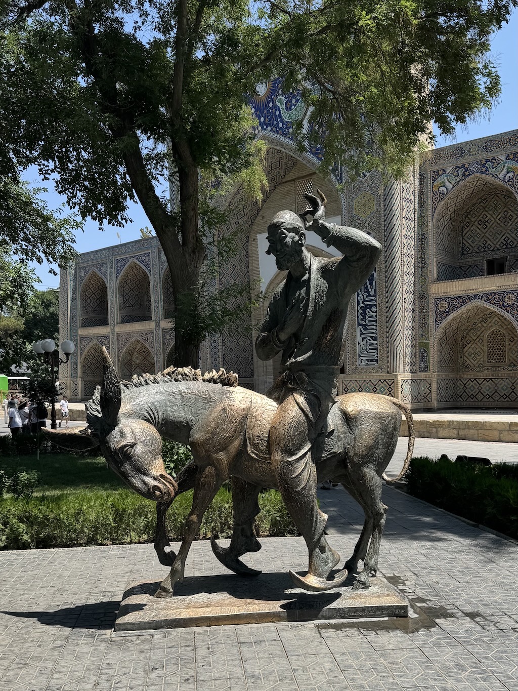By the end, we made it to the Lyabi Hauz area, with its water pool. One statue we were pointed to was the one of Nasreddin (on the donkey below), who is a folk character in the Muslim world. The Uzbek consider him one of their own, from Bukhara.