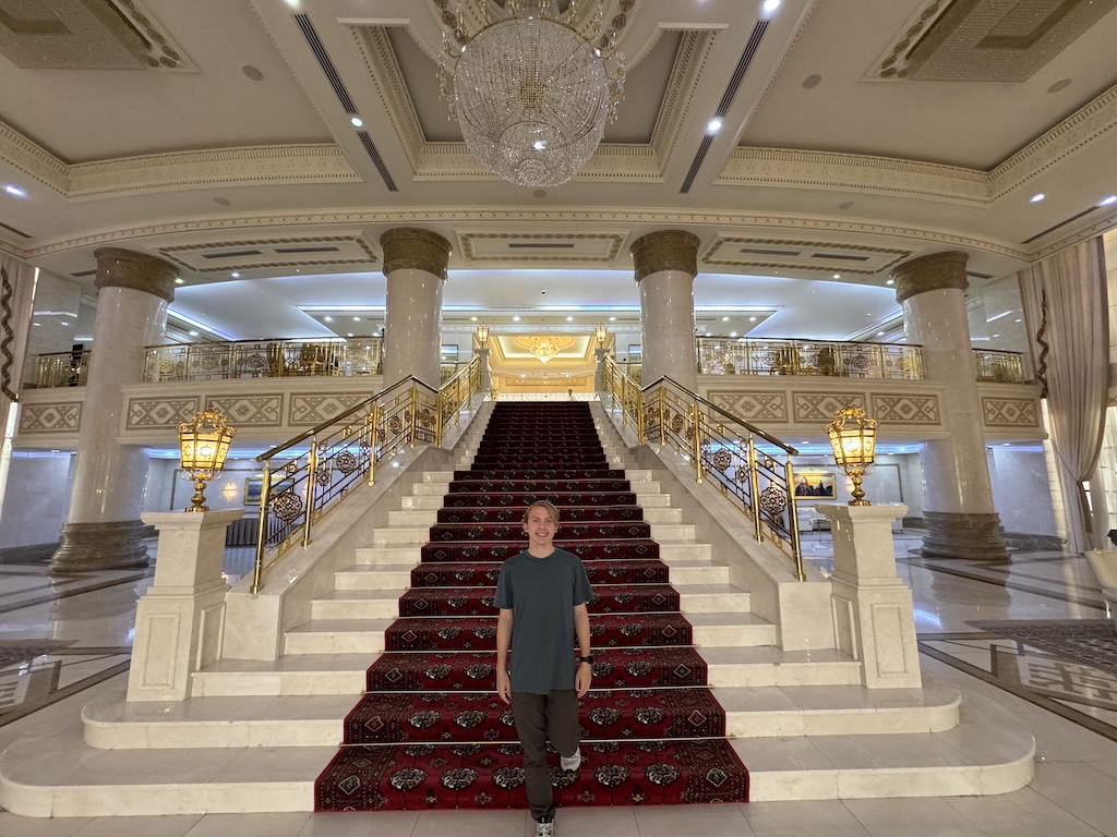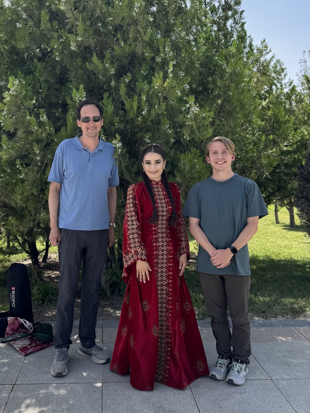 As we were concluding our time in Ashgabat (I believe the plan was to leave town roughly 4pm), we went to a monument where it’s common for folks to get photos. There were some men and women there who had just finished university and were getting photographed in their school uniform attire. This was maybe a little odd, but our guide encouraged us to have our pictures taken with them and talk with them, so we did. Anyway.