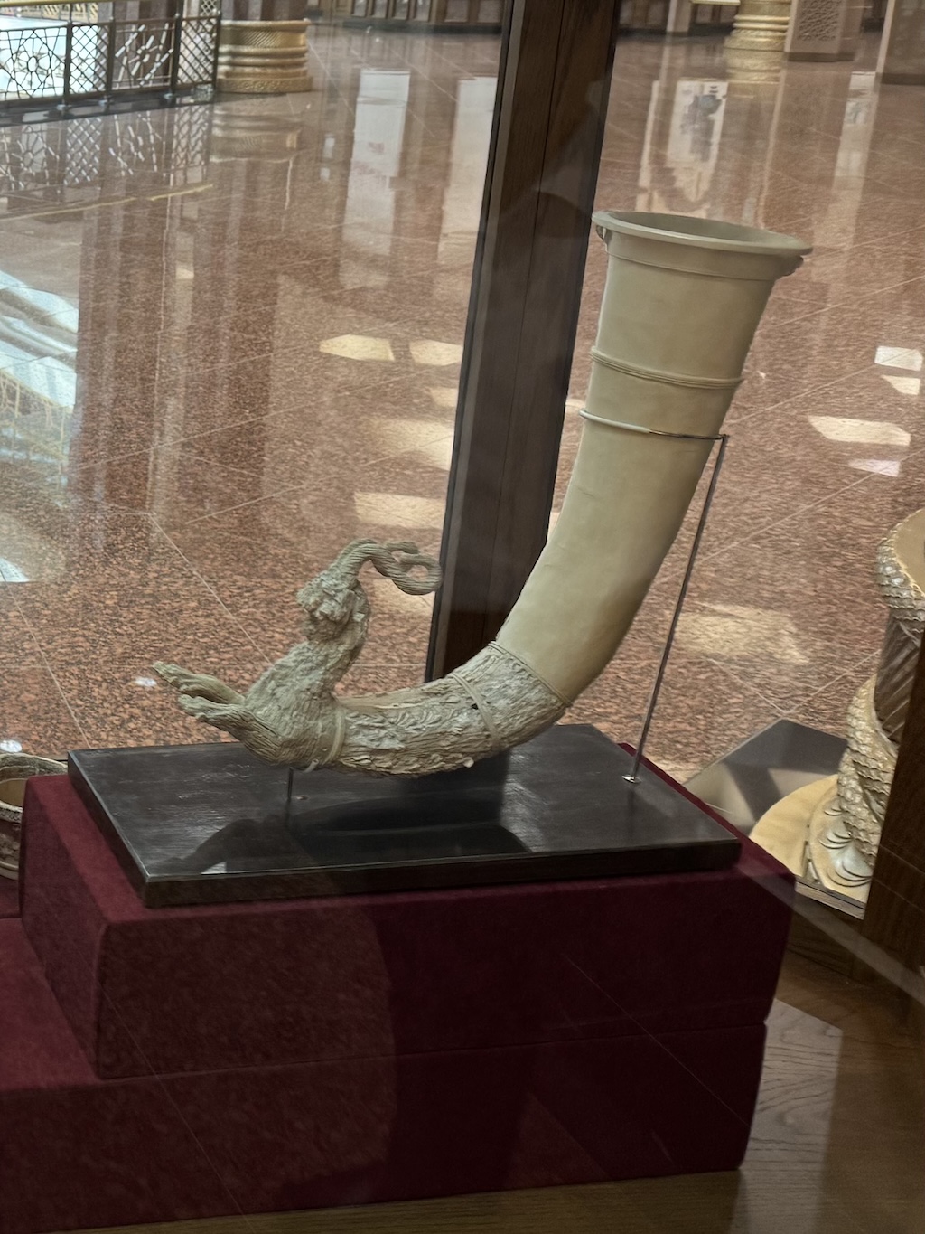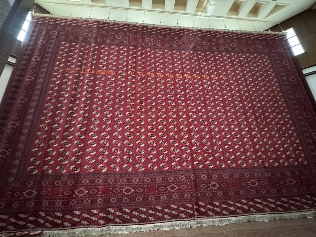 Our first visit was the State Museum of Turkmenistan. We were given a guided tour in English by one of the museum staff. It was an interesting tour, which encompassed some ancient artifacts (like an elephant tusk used to hold wine), a huge rug, and photos of their leader, which are fairly common around the country.