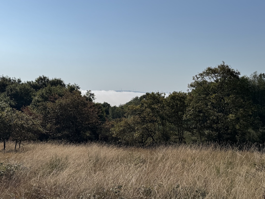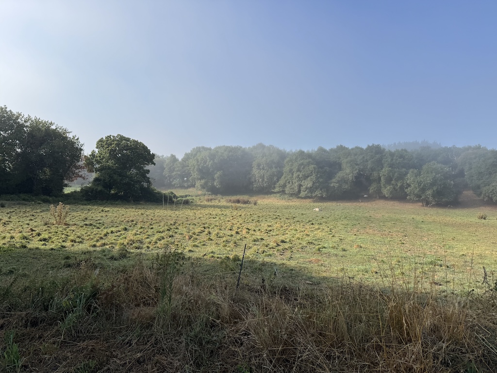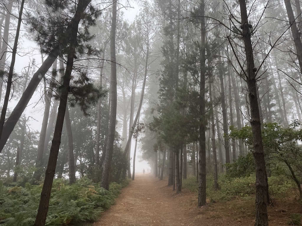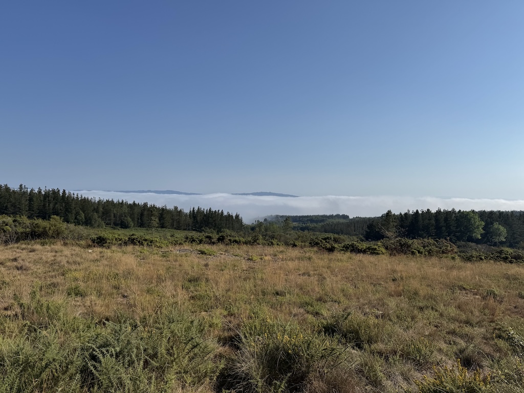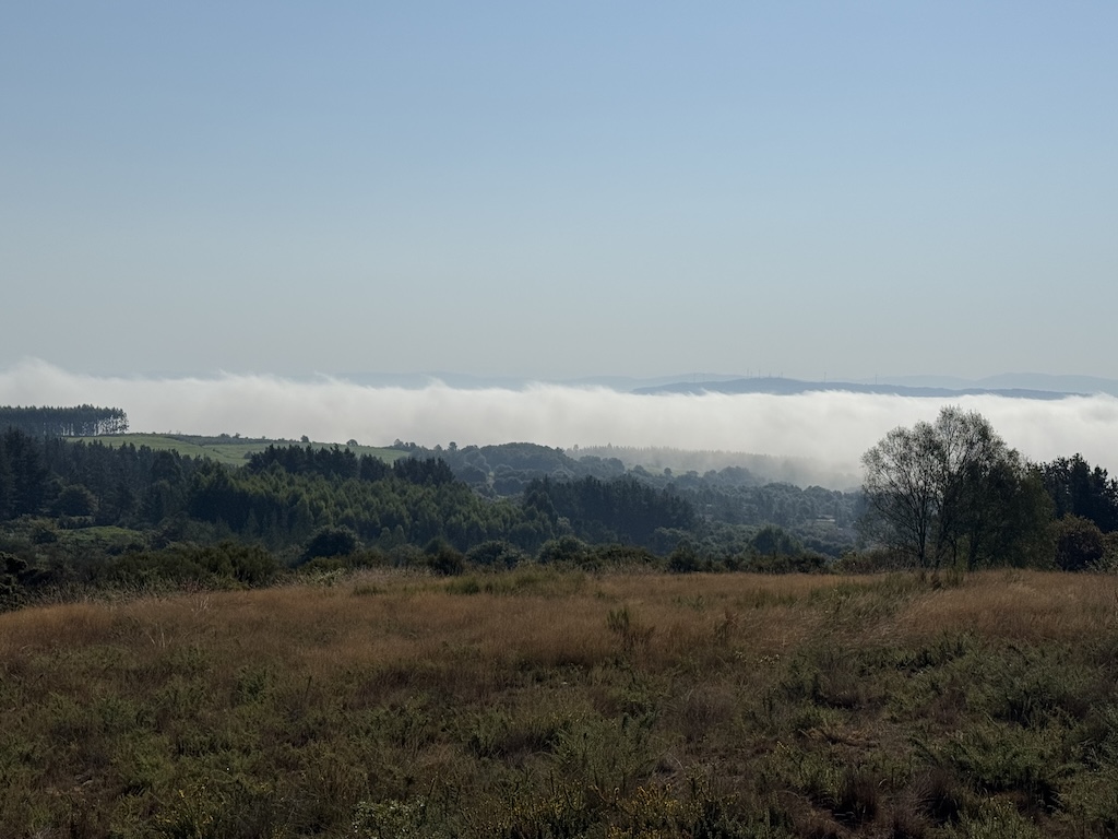 The route was mostly slightly uphill in the morning, and slightly downhill in the latter part. I loved the look of the fog in the forested area as well The landscapes seemed to alternate between small farms and forests. As I got higher and it got later in the morning, the fog was starting to diminish.