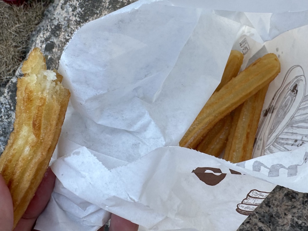 One other thing I saw – there was a street-side churro stand, where the vendor was frying churros in a vat of oil on the side of the sidewalk. Since this was a novelty for me, I decided to get an small order of 6, wrapped in paper, for ā¬2.